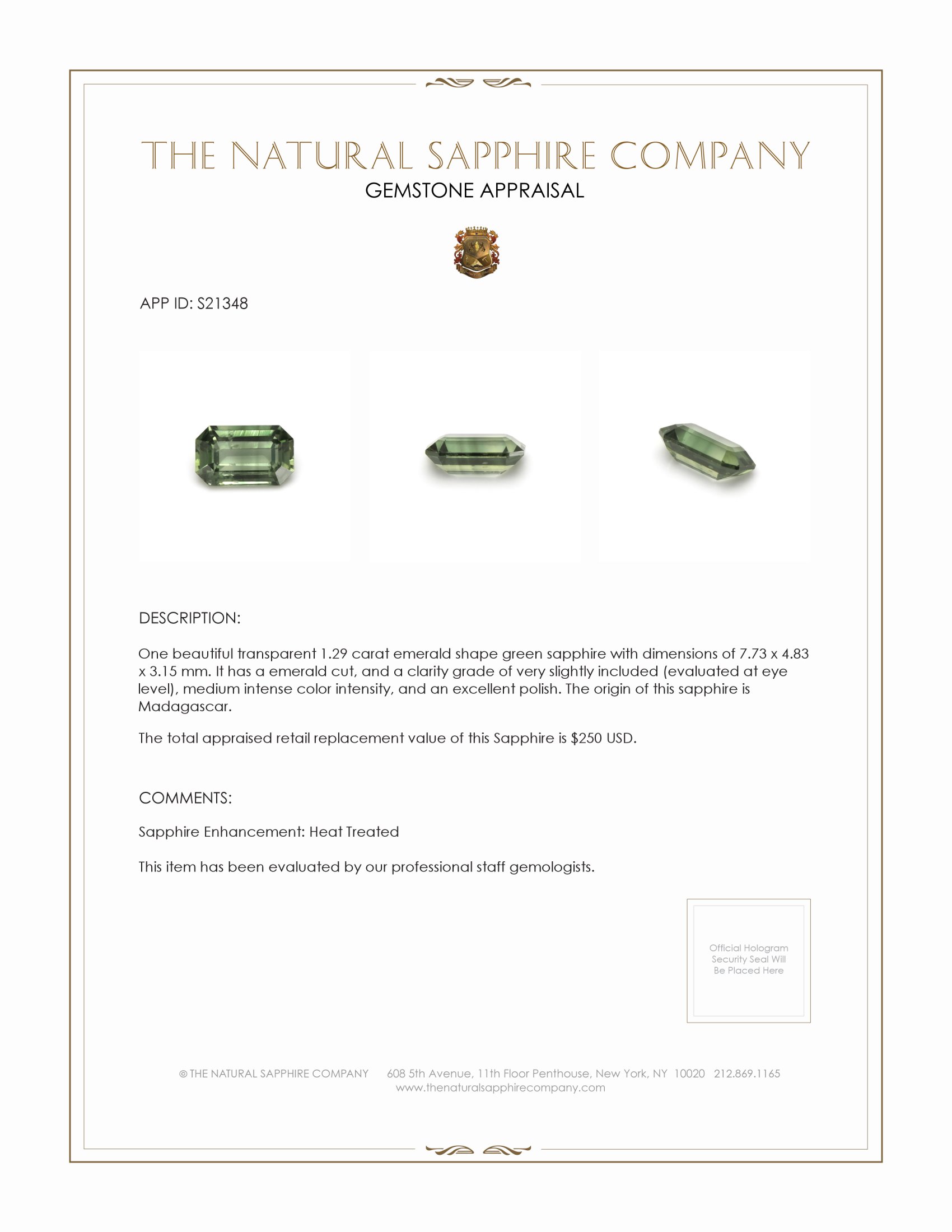 From the heart of Madagascar, cradled by time and nature's meticulous craftsmanship, emerges a gem that speaks to the soul. This green sapphire, with its journey beginning in the enigmatic depths of the earth, embodies a rich tapestry of history and allure. Born from intense geological phenomena, it has transformed under the heat and pressure, gaining its distinct emerald cut with dimensions of 7.73 x 4.83 x 3.15 mm. Its clarity, subtly marred by very slight inclusions, whispers of its authentic and natural origin, while its medium intense color saturation draws the eye into a sea of rich, verdant green.