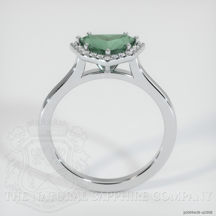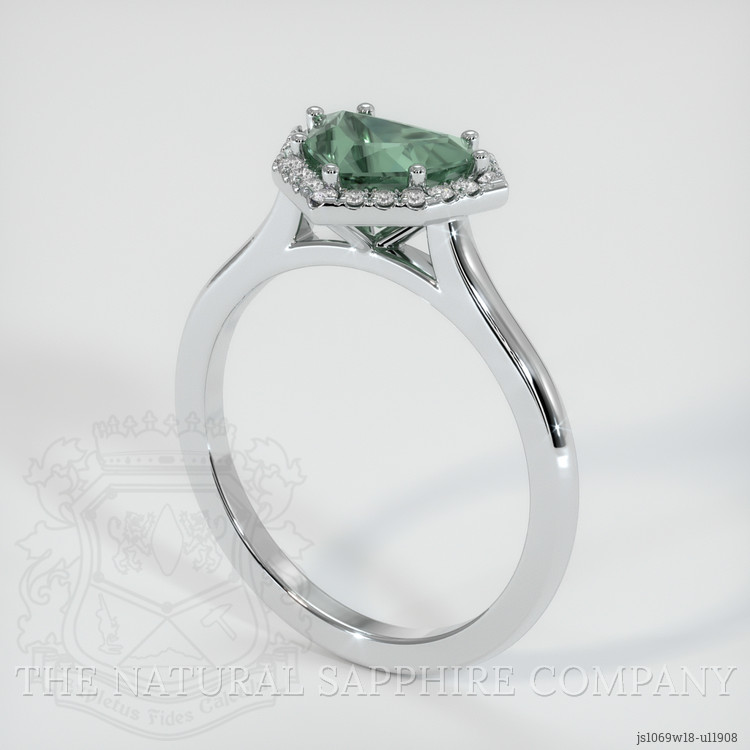 The ring features a beautiful, transparent 1.20 carat fancy shape green sapphire with the dimensions of 5.88 x 7.90 x 4.28 mm and a fancy brilliant cut. It has a clarity grade of very slightly included (evaluated at eye level), intense color saturation, and an excellent polish. The origin of this sapphire is Montana.