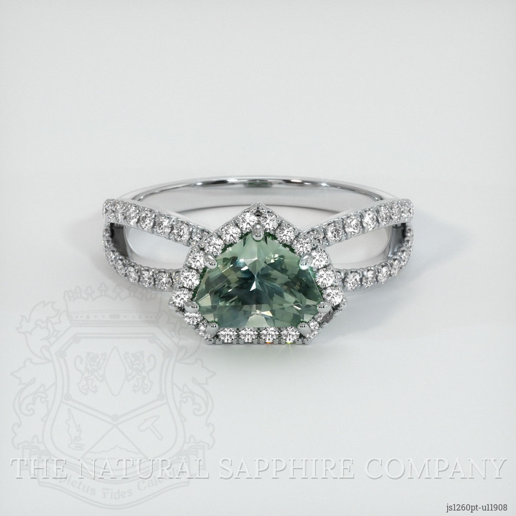 The ring features a beautiful, transparent 1.20 carat fancy shape green sapphire with the dimensions of 5.88 x 7.90 x 4.28 mm and a fancy brilliant cut. It has a clarity grade of very slightly included (evaluated at eye level), intense color saturation, and an excellent polish. The origin of this sapphire is Montana.