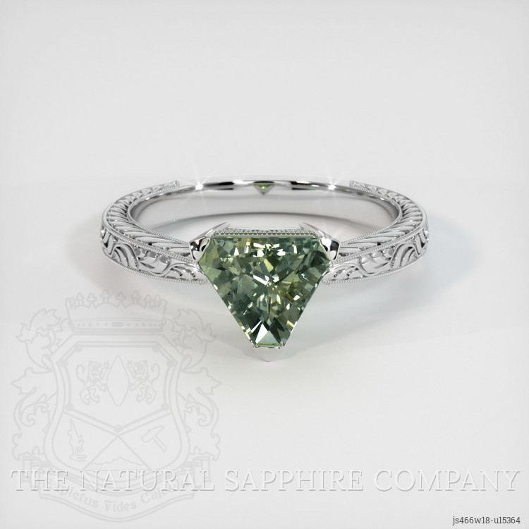 The ring features a beautiful, transparent 1.23 carat fancy shape green sapphire with the dimensions of 6.89 x 7.54 x 3.73 mm and a fancy cut. It has a clarity grade of eye clean (evaluated at eye level), intense color saturation, and an excellent polish. The origin of this sapphire is Montana.