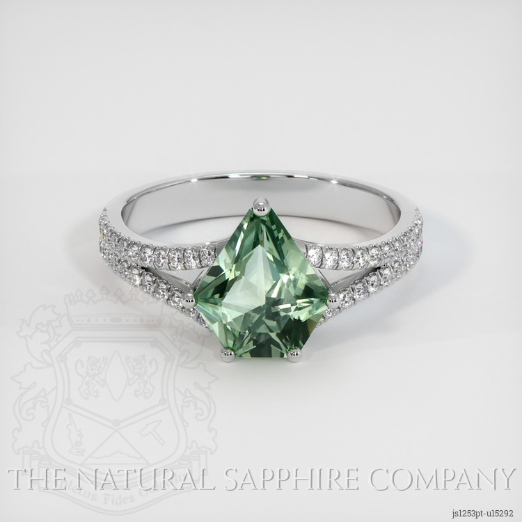 The ring features a beautiful, transparent 1.80 carat fancy shape green sapphire with the dimensions of 8.89 x 8.46 x 3.98 mm and a fancy brilliant cut. It has a clarity grade of very slightly included (evaluated at eye level), medium intense color saturation, and an excellent polish. The origin of this sapphire is Montana.