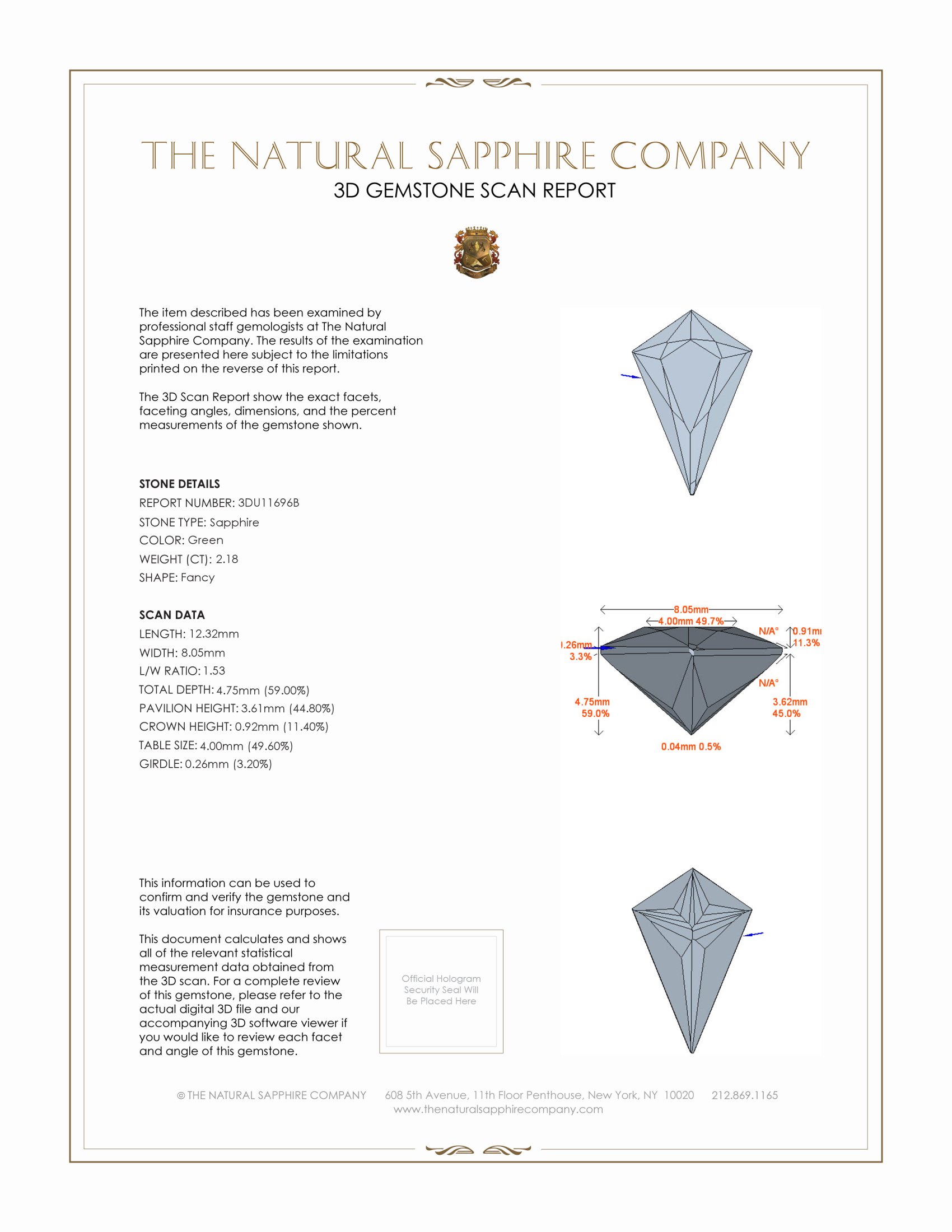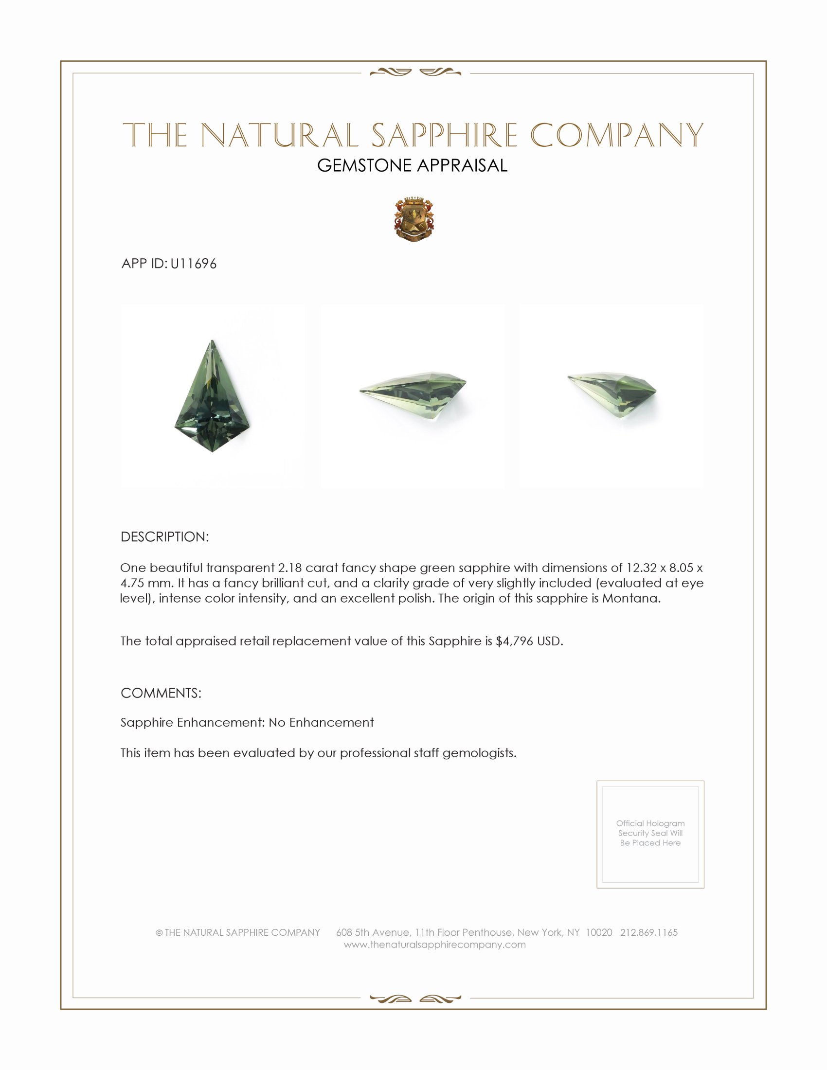 Discover the unparalleled allure of a remarkable piece that defines exclusivity and timeless elegance. Welcome to a world where only a select few can hold the beauty of nature's rarest gems with this enchanting ring from The Natural Sapphire Company. This piece features an exquisite 2.18 carat fancy shape green sapphire sourced from the renowned mines of Montana. Its dimensions, measuring 12.32 x 8.05 x 4.75 mm, are meticulously designed to showcase its splendid fancy brilliant cut. The sapphire's intense color saturation is further enriched by its excellent polish, capturing light in a mesmerizing dance. With a clarity grade of very slightly included, evaluated at eye level, it becomes more than just a gemstone, promising a lifetime of treasured memories each time you wear it.