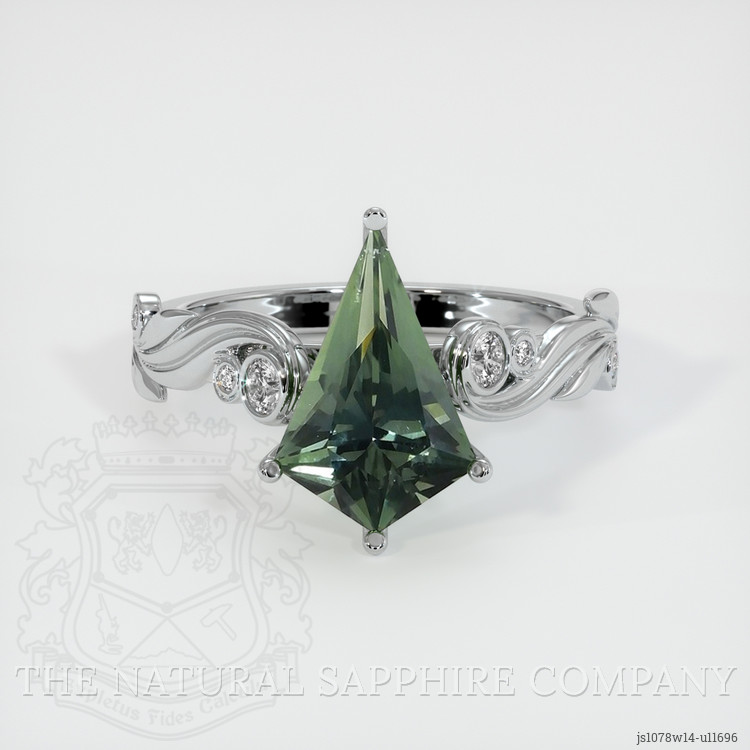 The ring features a beautiful, transparent 2.18 carat fancy shape green sapphire with the dimensions of 12.32 x 8.05 x 4.75 mm and a fancy brilliant cut. It has a clarity grade of very slightly included (evaluated at eye level), intense color saturation, and an excellent polish. The origin of this sapphire is Montana.
