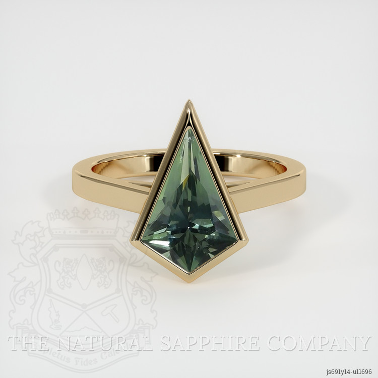 The ring features a beautiful, transparent 2.18 carat fancy shape green sapphire with the dimensions of 12.32 x 8.05 x 4.75 mm and a fancy brilliant cut. It has a clarity grade of very slightly included (evaluated at eye level), intense color saturation, and an excellent polish. The origin of this sapphire is Montana.