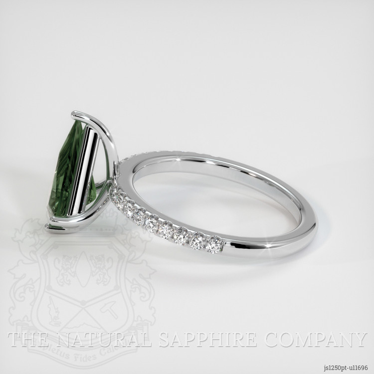 The ring features a beautiful, transparent 2.18 carat fancy shape green sapphire with the dimensions of 12.32 x 8.05 x 4.75 mm and a fancy brilliant cut. It has a clarity grade of very slightly included (evaluated at eye level), intense color saturation, and an excellent polish. The origin of this sapphire is Montana.