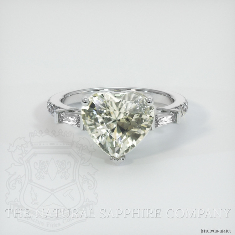 The ring features a beautiful, transparent 4.63 carat heart shape green sapphire with the dimensions of 9.39 x 10.27 x 6.55 mm and a mixed brilliant cut. It has a clarity grade of very slightly included (evaluated at eye level), medium light color saturation, and an excellent polish. The origin of this sapphire is Ceylon (Sri Lanka).