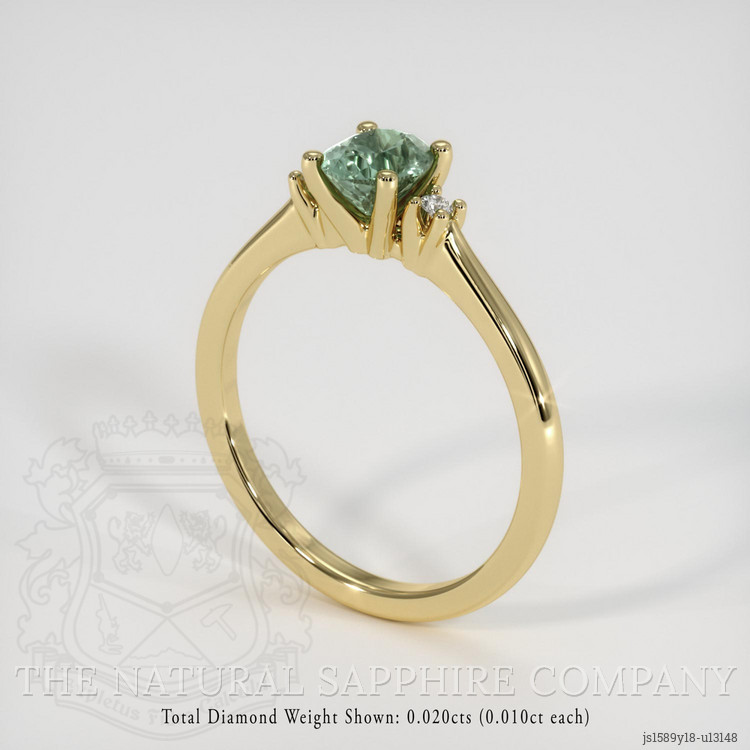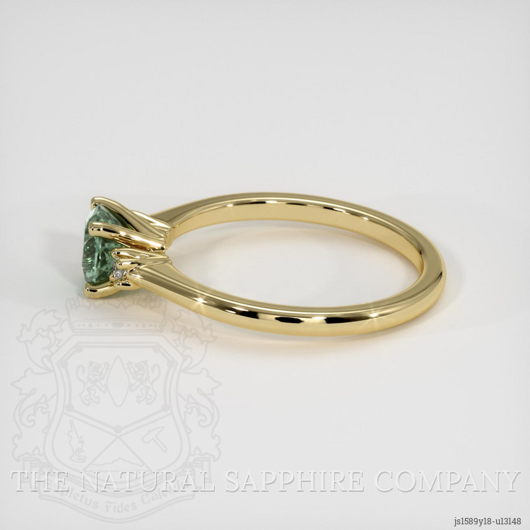 The ring features a beautiful, transparent 0.65 carat oval shape green sapphire with the dimensions of 5.36 x 4.74 x 3.42 mm and a mixed brilliant cut. It has a clarity grade of eye clean (evaluated at eye level), medium light color saturation, and an excellent polish. The origin of this sapphire is Montana.