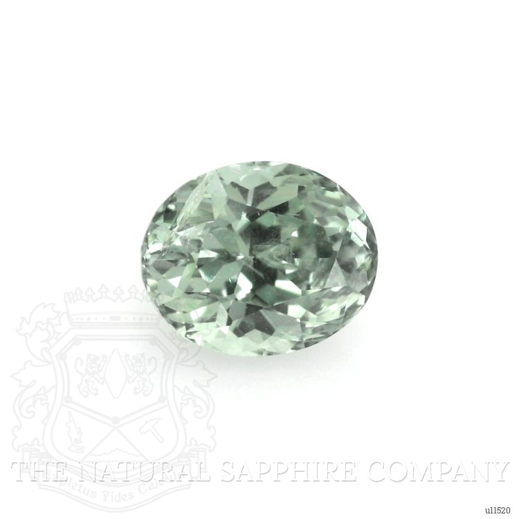 The ring features a beautiful, transparent 0.88 carat oval shape green sapphire with the dimensions of 5.99 x 4.88 x 3.93 mm and a mixed brilliant cut. It has a clarity grade of very slightly included (evaluated at eye level), medium intense color saturation, and an excellent polish. The origin of this sapphire is Montana.