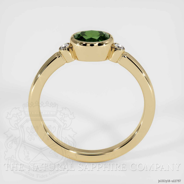 The ring features a beautiful, transparent 0.89 carat oval shape green sapphire with the dimensions of 6.07 x 5.12 x 3.79 mm and a mixed brilliant cut. It has a clarity grade of eye clean (evaluated at eye level), intense color saturation, and an excellent polish. The origin of this sapphire is Montana.