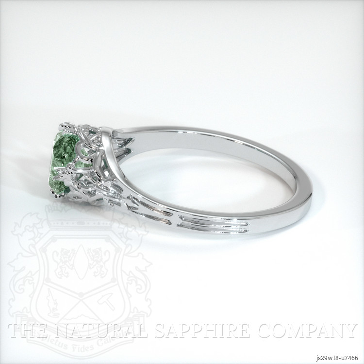 The ring features a beautiful, transparent 0.98 carat oval shape green sapphire with the dimensions of 6.18 x 5.33 x 3.87 mm and a mixed brilliant cut. It has a clarity grade of very slightly included (evaluated at eye level), medium intense color saturation, and an excellent polish. The origin of this sapphire is Montana.