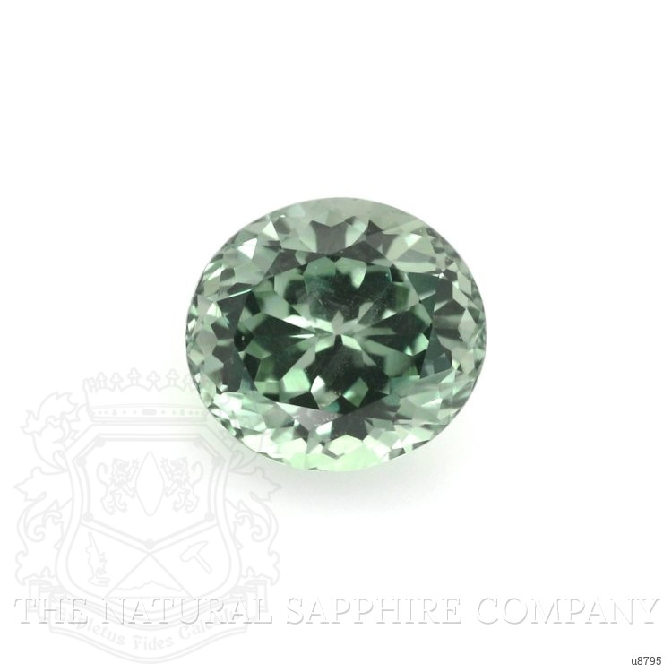 The ring features a beautiful, transparent 1.00 carat oval shape green sapphire with the dimensions of 6.05 x 5.48 x 3.85 mm and a mixed brilliant cut. It has a clarity grade of very slightly included (evaluated at eye level), intense color saturation, and an excellent polish. The origin of this sapphire is Montana.