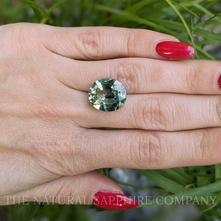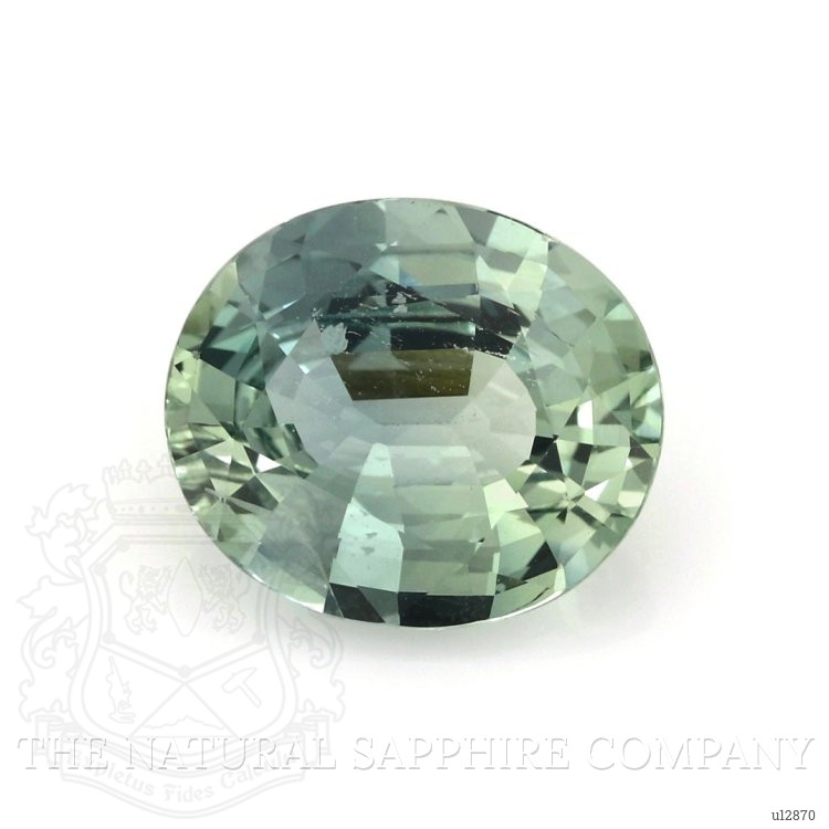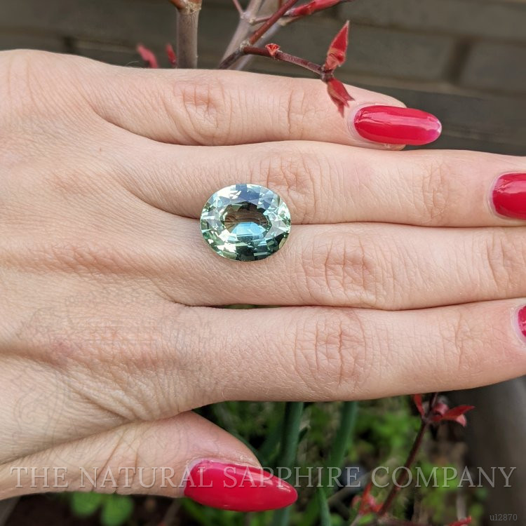 The ring features a beautiful, transparent C.Dunaigre certified Green 11.37 carat oval shape green sapphire with the dimensions of 15.56 x 13.42 x 6.64 mm and a mixed brilliant cut. It has a clarity grade of very slightly included (evaluated at eye level), medium color saturation, and an excellent polish. The origin of this sapphire is East Africa.