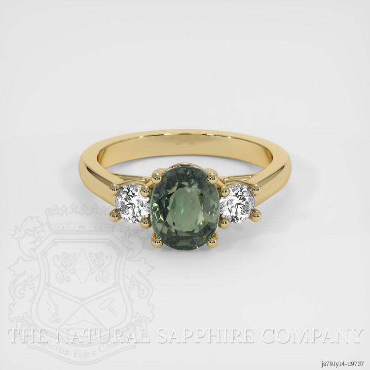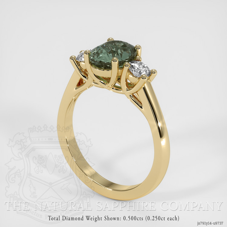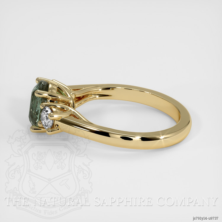 In setting this green sapphire, we drew inspiration from the spectacular historical pieces adored by royalty through the ages. The 14K yellow gold band cradles the gemstone much like those seen in celebrated crown jewels, wherein gold amplifies the rich hues of the sapphire. The band’s elegant curve complements the stone, epitomizing both classical charm and contemporary grace. Accompanying the sapphire are white natural diamonds totaling approximately 0.50 carats. They are round in shape and possess a clarity of VS1 to VS2 and an immaculate E color grade, enhancing the central gem's brilliance like stars accentuating a bright moon.