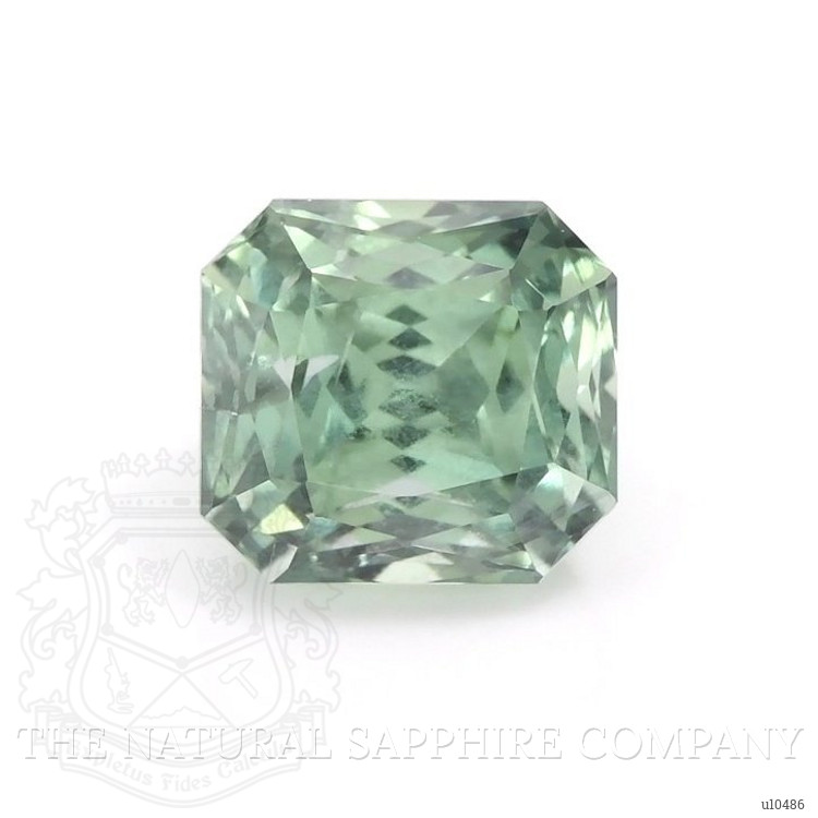 The ring features a beautiful, transparent 1.06 carat radiant shape green sapphire with the dimensions of 5.46 x 5.03 x 4.31 mm and a radiant cut. It has a clarity grade of very slightly included (evaluated at eye level), medium color saturation, and an excellent polish. The origin of this sapphire is Montana.
