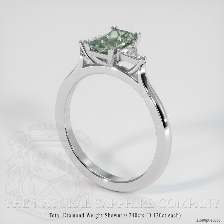 The ring features a beautiful, transparent 1.11 carat radiant shape green sapphire with the dimensions of 7.49 x 4.63 x 3.17 mm and a radiant cut. It has a clarity grade of very slightly included (evaluated at eye level), light color saturation, and an excellent polish. The origin of this sapphire is Montana.