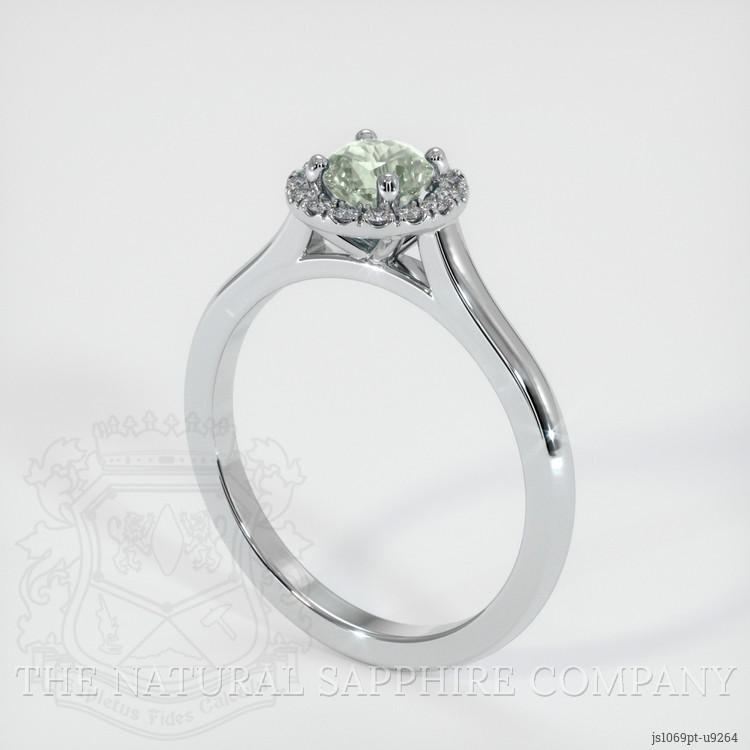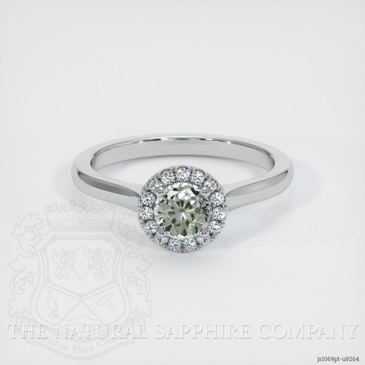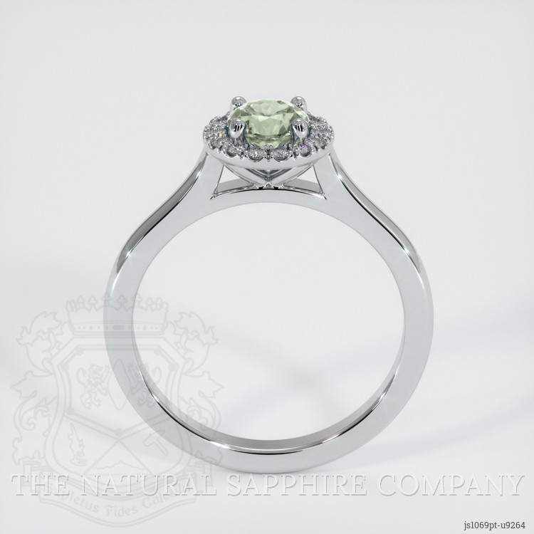 The ring features a beautiful, transparent 0.63 carat round shape green sapphire with the dimensions of 4.98 x 4.92 x 3.49 mm and a mixed brilliant cut. It has a clarity grade of very slightly included (evaluated at eye level), faint color saturation, and an excellent polish. The origin of this sapphire is Montana.