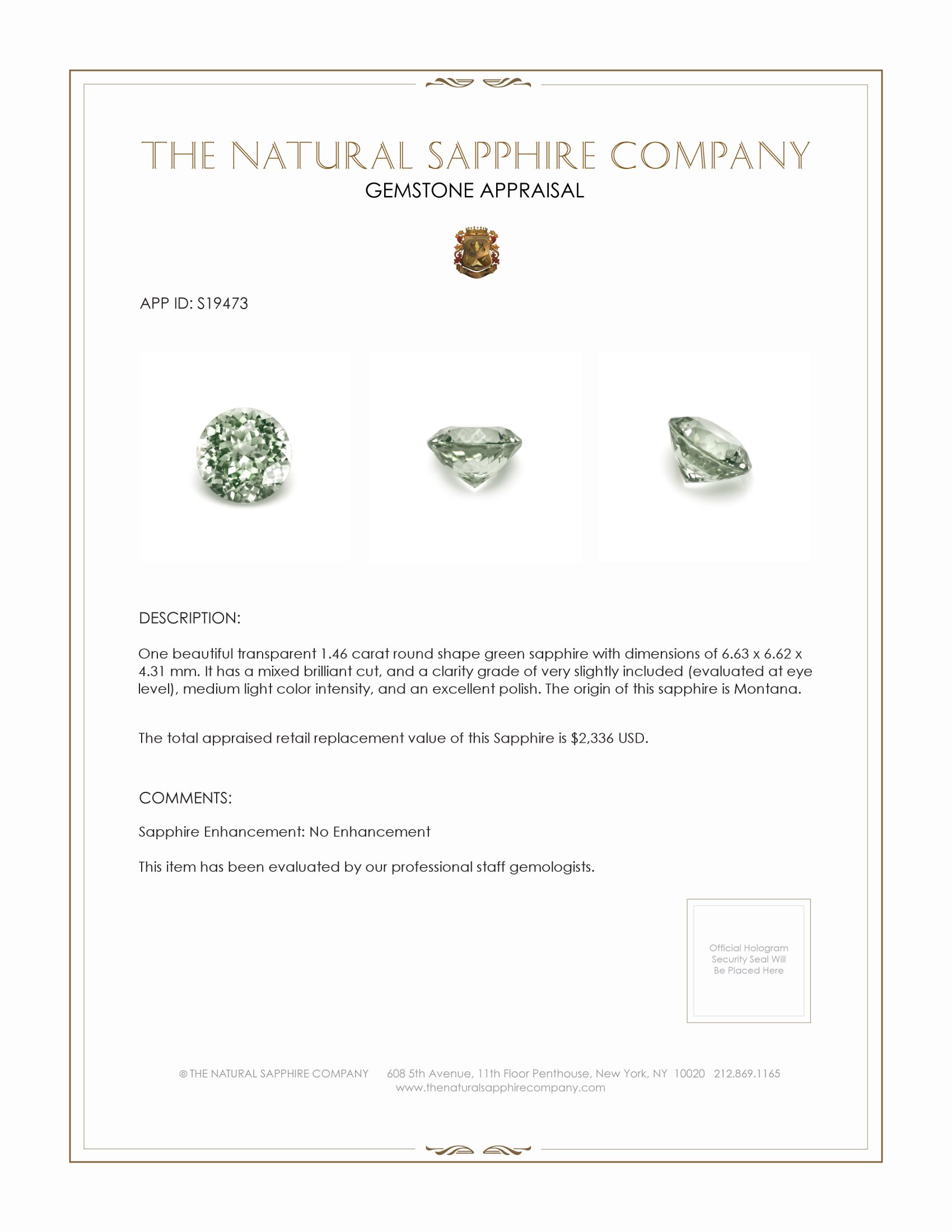 Discover the pinnacle of elegance and individuality with our exquisite Montana green sapphire ring, a hallmark of unrivaled beauty from The Natural Sapphire Company. For those in search of the ideal engagement ring or a distinctive gemstone to enrich a collection, this masterpiece promises to fulfill your desires with grace and sophistication. At 1.46 carats, the transparent round-shaped green sapphire stands as a testament to nature's artistry, graced by dimensions of 6.63 x 6.62 x 4.31 mm and crafted to perfection with a mixed brilliant cut. This sapphire hails from the pristine landscapes of Montana, infusing the gemstone with an essence as untamed and pure as its origins.