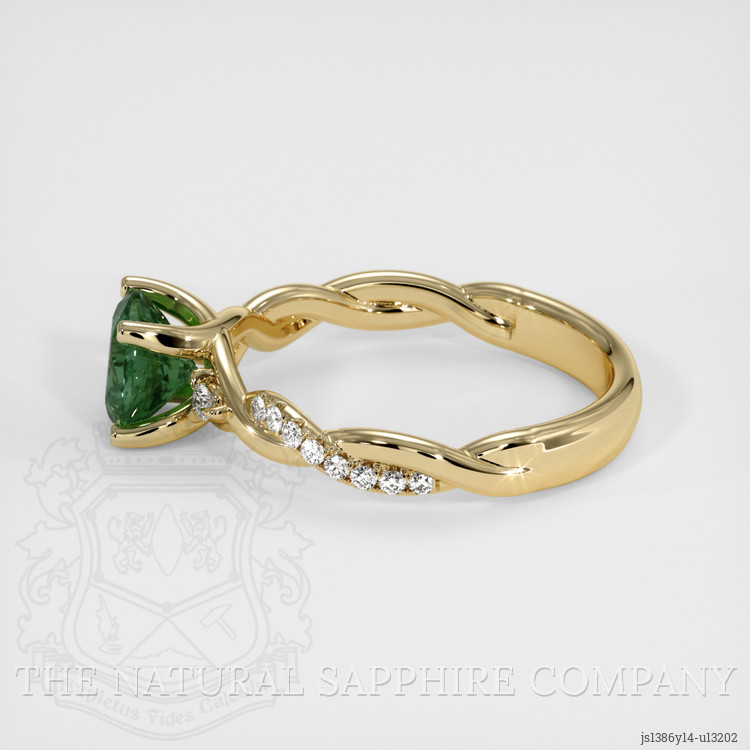 The ring features a beautiful, transparent 1.66 carat round shape green sapphire with the dimensions of 7.02 x 6.93 x 4.37 mm and a mixed brilliant cut. It has a clarity grade of very slightly included (evaluated at eye level), intense color saturation, and an excellent polish. The origin of this sapphire is Montana.