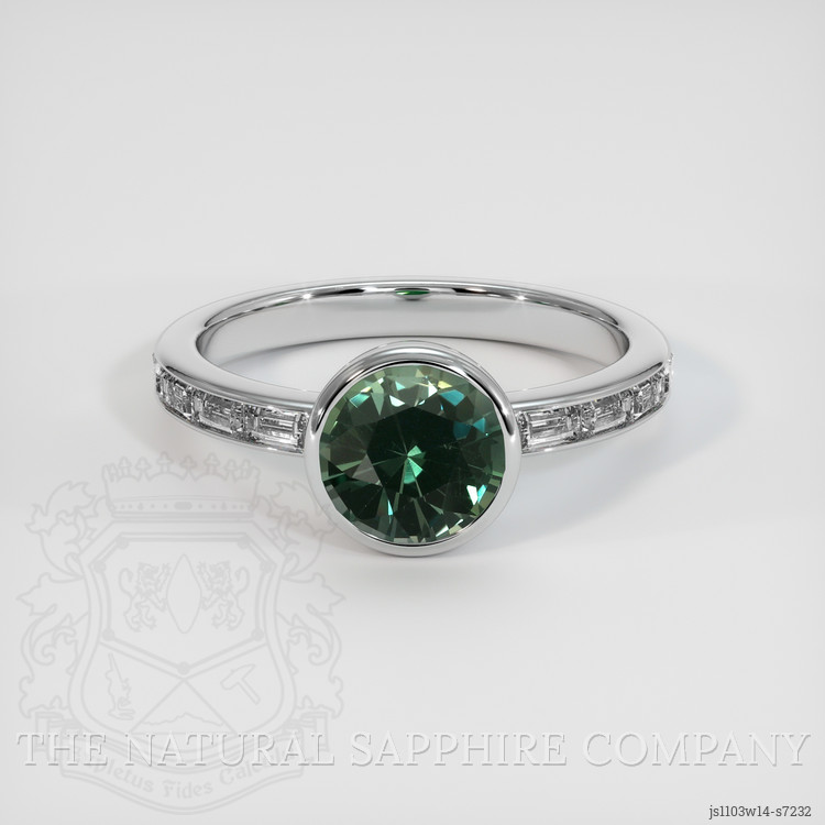 The stone undergoes a metamorphosis through the skilled hands of our craftsmen, who honor its origins by preserving its natural beauty. The sapphire’s dimensions, precisely 7.62 x 7.48 x 5.15 mm, are thoughtfully shaped with a mixed brilliant cut, accentuating its clarity, described as eye clean and revealing an emerald-like hue unsurpassed in its vivid saturation. Nestled alongside are elegant, straight white baguette diamonds, each worthy of its presence. These diamonds boast a color grade of E and VS1, VS2 clarity, offering a pure radiance. The setting is meticulously crafted in 14K white gold, a sophisticated embrace for these rare stones, manifesting a ring both modern and timeless.