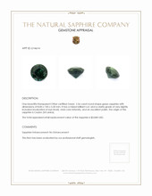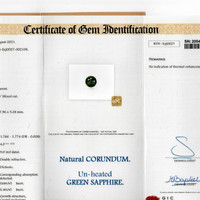The ring features a beautiful, transparent Other certified Green 2.56 carat round shape green sapphire with the dimensions of 8.00 x 7.85 x 5.30 mm and a mixed brilliant cut. It has a clarity grade of very slightly included (evaluated at eye level), vivid color saturation, and an excellent polish. The origin of this sapphire is Ceylon (Sri Lanka).