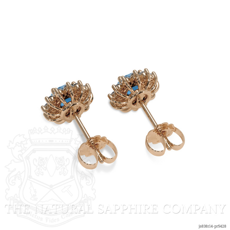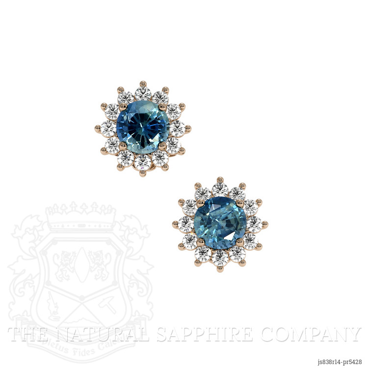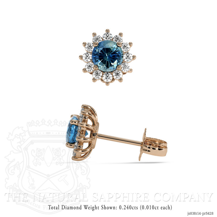 These earrings from The Natural Sapphire Company pair classic design with gemological integrity, offering a level of quality that stands out from many mass market options, The centerpiece is a matched pair of transparent sapphires totaling 0.69 carat weight, each a round greenish blue stone cut to mixed brilliant proportions and measuring 4.13 by 4.07 by 2.75 millimeters, The sapphires are unenhanced, sourced from Ceylon Sri Lanka, and show intense color saturation with an excellent polish, The clarity is graded very slightly included at eye level, which means they deliver clean lively sparkle without the common treatments or compromises often found in lower priced pieces, Surrounding each sapphire is a halo of white round natural diamonds totaling approximately 0.24 carats, with color grade F and clarity VS1, VS2, Their fine color and eye clean quality boost the perceived size and brilliance of the center stones, The entire setting is crafted in 14K rose gold, a metal choice that complements the greenish blue tones with a warm lustre and offers superior durability and hypoallergenic wear compared with many plated or low karat alternatives, When you compare these earrings to similar designs on the market you see the advantage of genuine untreated Ceylon sapphires, precision cutting and responsible sourcing, rather than lower value synthetic or heavily treated stones that may lack depth of color or resale appeal.