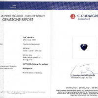 The necklace features a beautiful, transparent C.Dunaigre certified Intense Blue 13.10 carat heart shape greenish blue sapphire with the dimensions of 12.46 x 13.78 x 9.02 mm and a mixed brilliant cut. It has a clarity grade of slightly included (evaluated at eye level), intense color saturation, and an excellent polish. The origin of this sapphire is Madagascar.