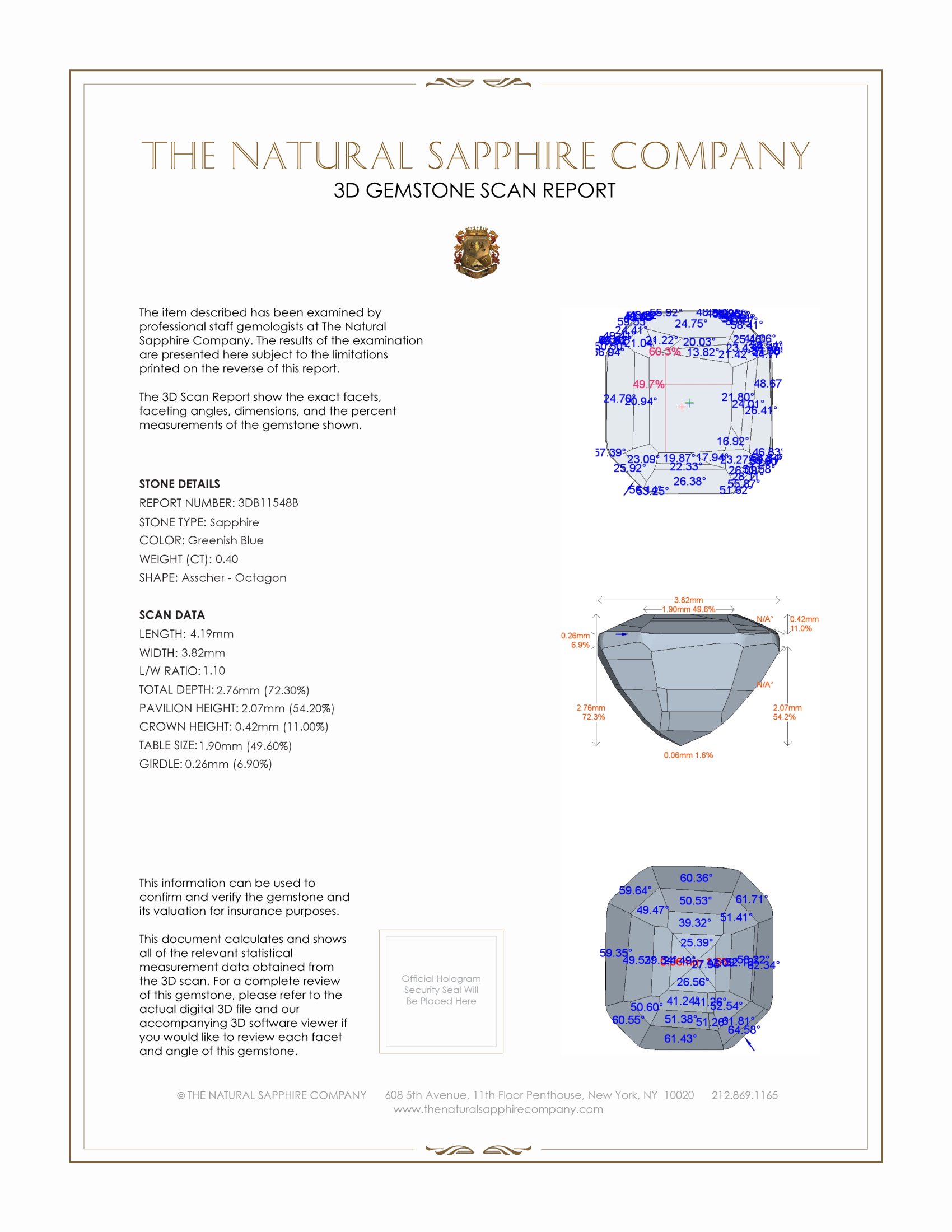The ring features a beautiful, transparent 0.40 carat asscher - octagon shape greenish blue sapphire with the dimensions of 4.19 x 3.82 x 2.76 mm and a asscher cut. It has a clarity grade of slightly included (evaluated at eye level), vivid color saturation, and an excellent polish. The origin of this sapphire is Montana.