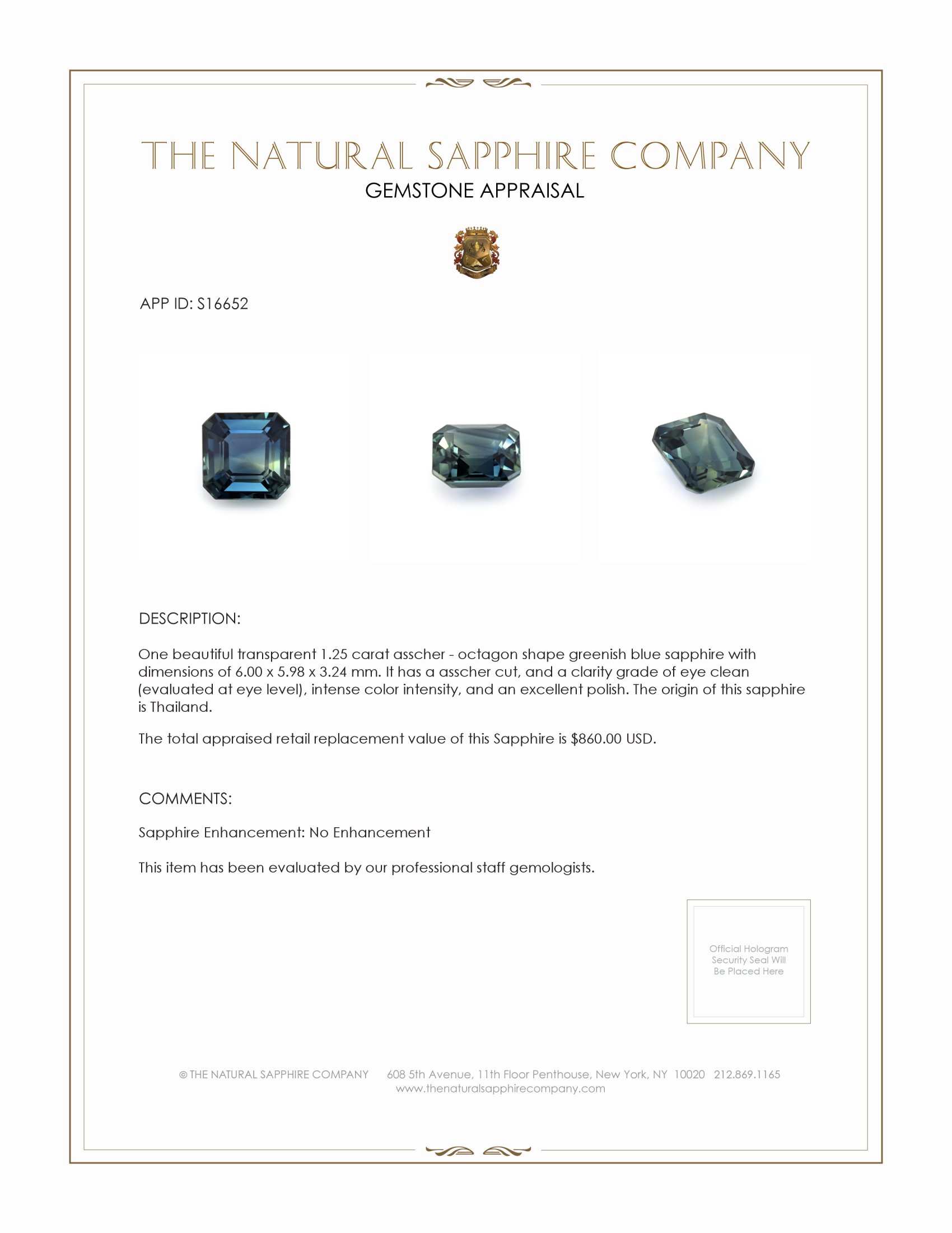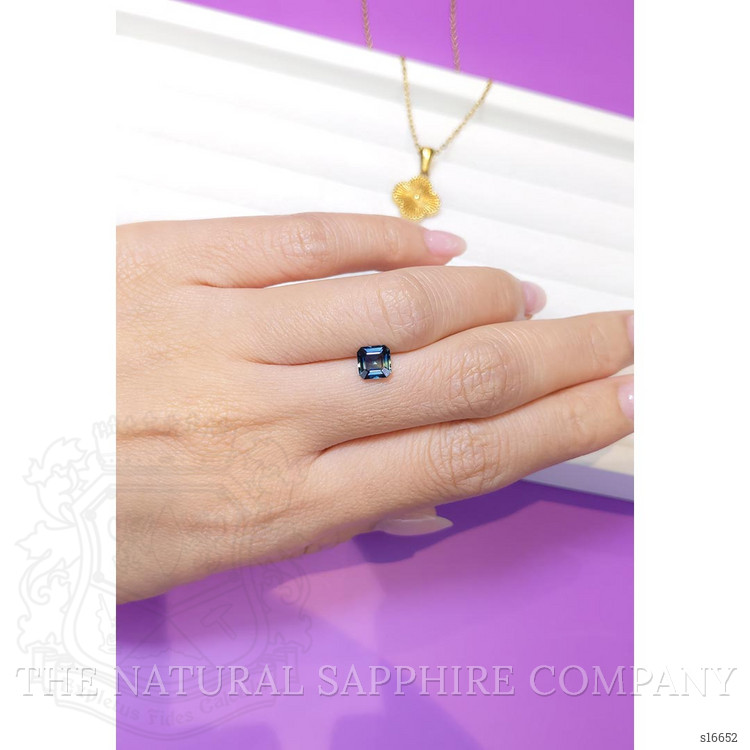 The sapphire boasts a greenish-blue hue with intense color saturation that mirrors the depths of the ocean in its purer form. Adding to its authenticity and natural beauty, this gemstone has no enhancements, showcasing the sapphire's inherent luster and natural appeal. Mined from Thailand, this sapphire reflects the rich tradition and quality associated with gemstones from this region, further enhanced by excellent polish that brings forth an impeccable shine.