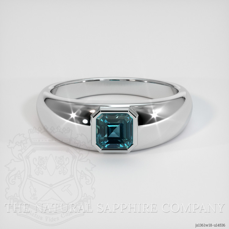 The men's ring features a beautiful, transparent 1.57 carat asscher - octagon shape greenish blue sapphire with the dimensions of 5.95 x 5.90 x 4.46 mm and a step cut. It has a clarity grade of very slightly included (evaluated at eye level), intense color saturation, and an excellent polish. The origin of this sapphire is Ceylon (Sri Lanka).
