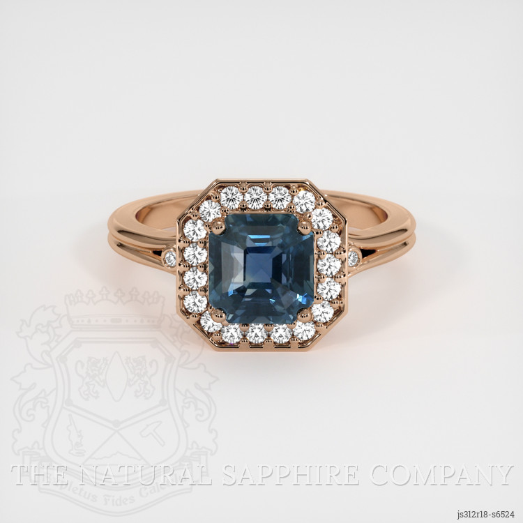 The ring features a beautiful, transparent 2.04 carat asscher - octagon shape greenish blue sapphire with the dimensions of 6.52 x 6.28 x 5.07 mm and a asscher cut. It has a clarity grade of eye clean (evaluated at eye level), intense color saturation, and an excellent polish. The origin of this sapphire is Ceylon (Sri Lanka).