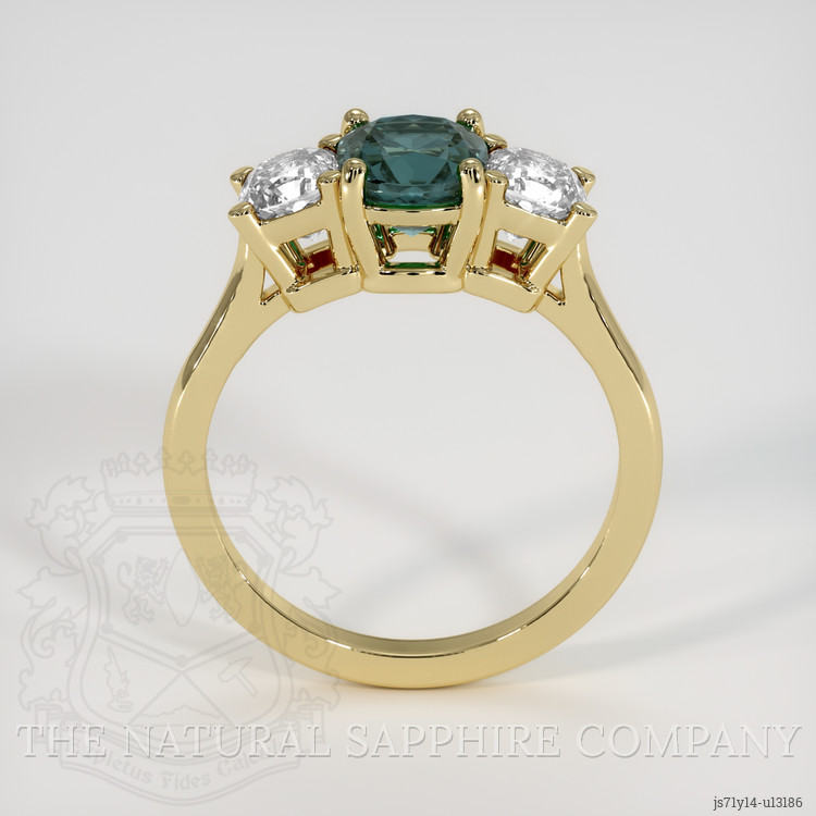 Our masterful setting of pure 18K yellow gold cradles this sapphire with tenderness, emphasizing its splendid hues and drawing the eye towards its vibrant dance of colors. The meticulously polished shine of the band plays off the vibrant glow of the sapphire, sparking joy in the hearts of all who lay eyes on it. This setting ensures that the sapphire remains the star of the show, radiating its unique greenish blue brilliance while nestling cozily between two dazzling white cushion-shaped diamonds. These diamonds, weighing approximately 0.80 carats and boasting a VS1, VS2 clarity, exude a gentle E color grade elegance, serving as elegant custodians of the mesmerizing sapphire. They add an extra layer of sophistication, their fire complementing the sapphire perfectly, creating a symphony of light.