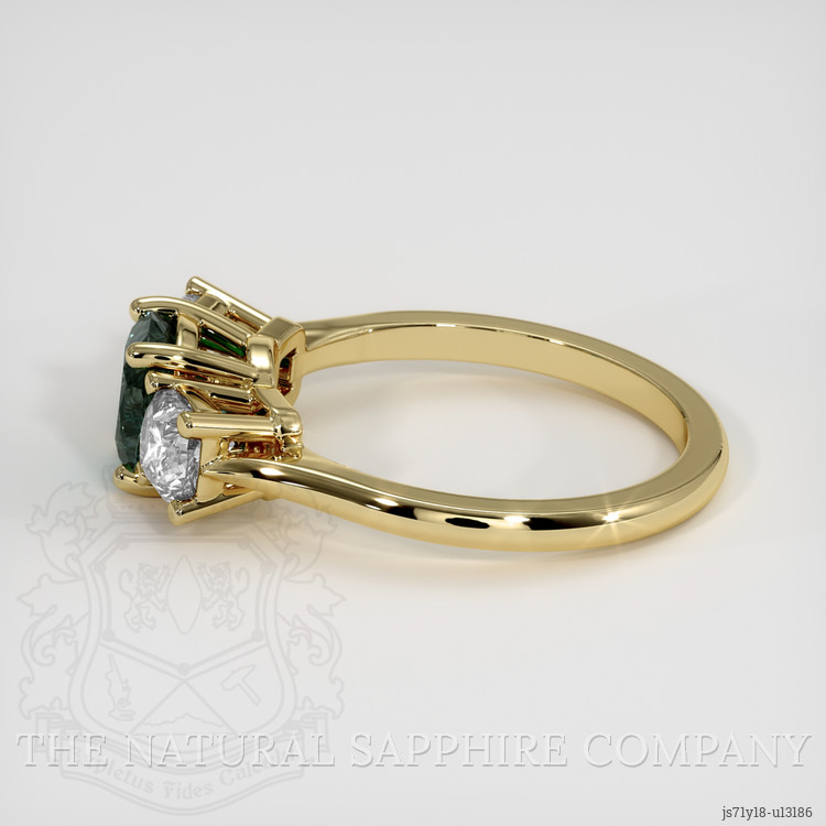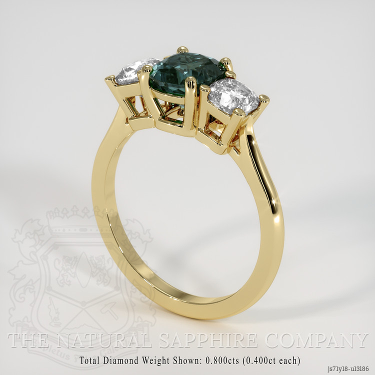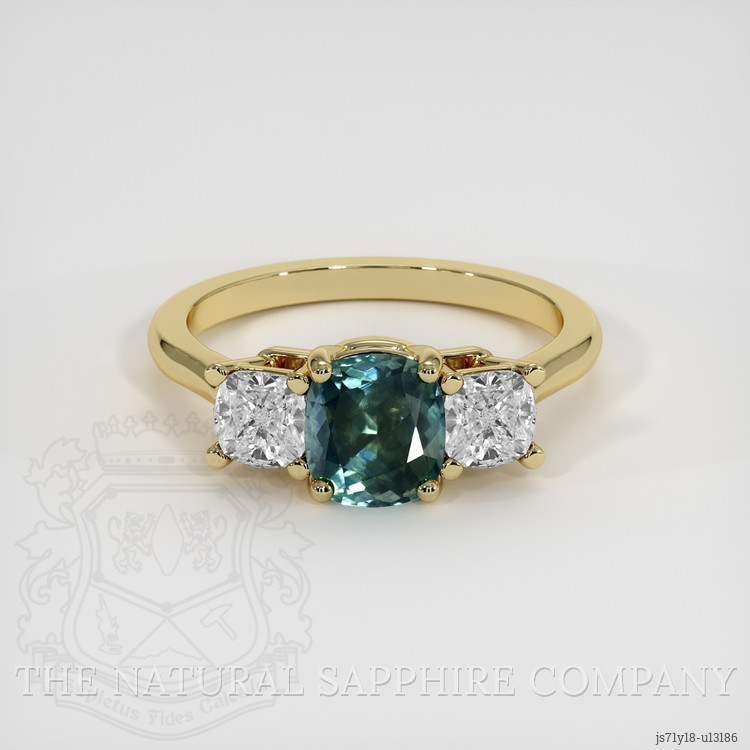 Our masterful setting of pure 18K yellow gold cradles this sapphire with tenderness, emphasizing its splendid hues and drawing the eye towards its vibrant dance of colors. The meticulously polished shine of the band plays off the vibrant glow of the sapphire, sparking joy in the hearts of all who lay eyes on it. This setting ensures that the sapphire remains the star of the show, radiating its unique greenish blue brilliance while nestling cozily between two dazzling white cushion-shaped diamonds. These diamonds, weighing approximately 0.80 carats and boasting a VS1, VS2 clarity, exude a gentle E color grade elegance, serving as elegant custodians of the mesmerizing sapphire. They add an extra layer of sophistication, their fire complementing the sapphire perfectly, creating a symphony of light.