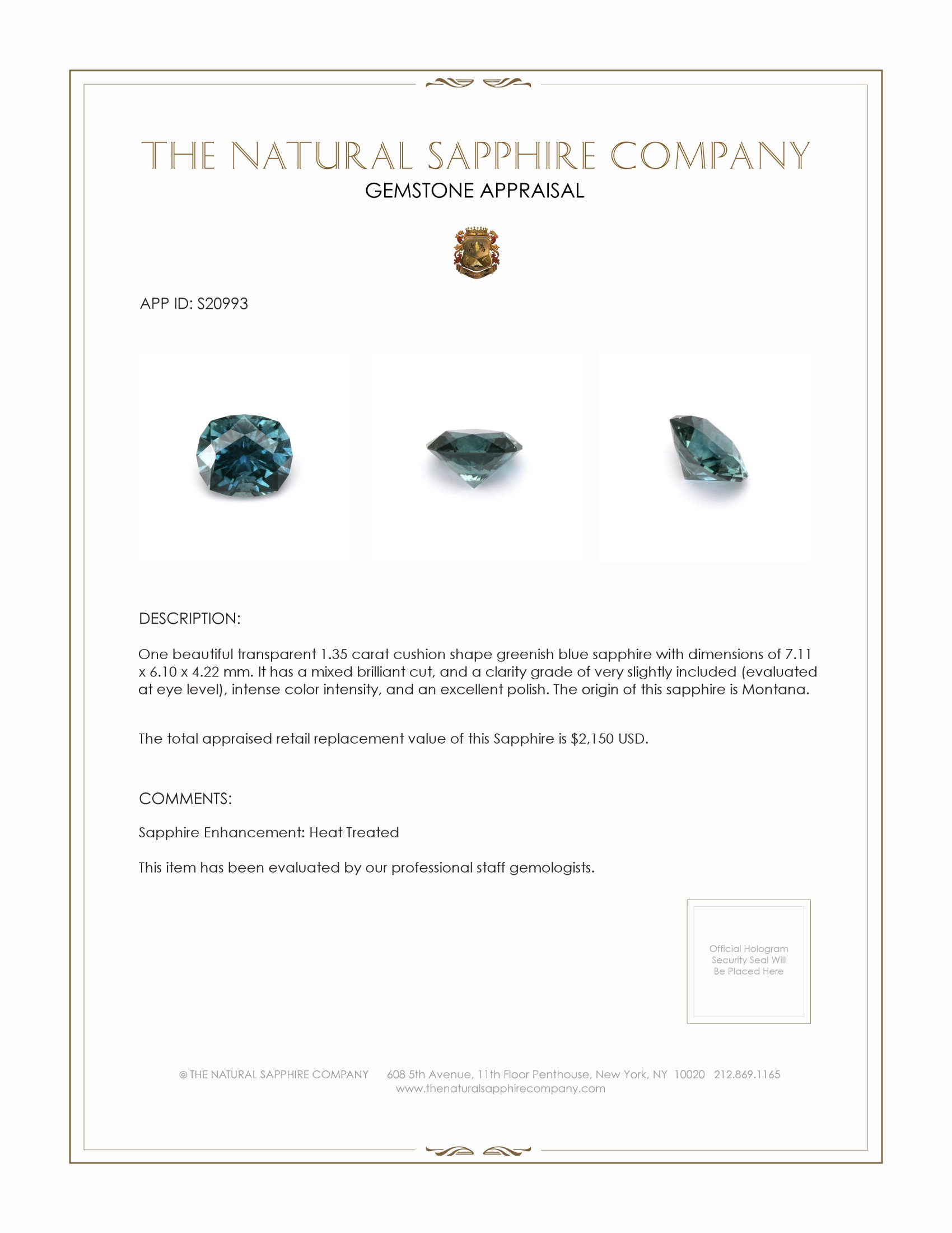 Discover true elegance with this magnificent ring featuring a 1.35 carat cushion-shaped greenish-blue sapphire from Montana. The sapphire's dimensions of 7.11 x 6.10 x 4.22 mm are perfectly complemented by its mixed brilliant cut, delivering unmatched brilliance and depth. Its clarity, very slightly included only when closely examined, along with intense color saturation and excellent polish, places it among the finest. Enhanced by delicate heat treatment, this sapphire transforms ordinary into something extraordinary. This precious gem captures the light in a unique dance, reflecting more vibrantly than other cuts and styles—a spectacle to cherish, unrivaled because of its elite origin and craftsmanship.