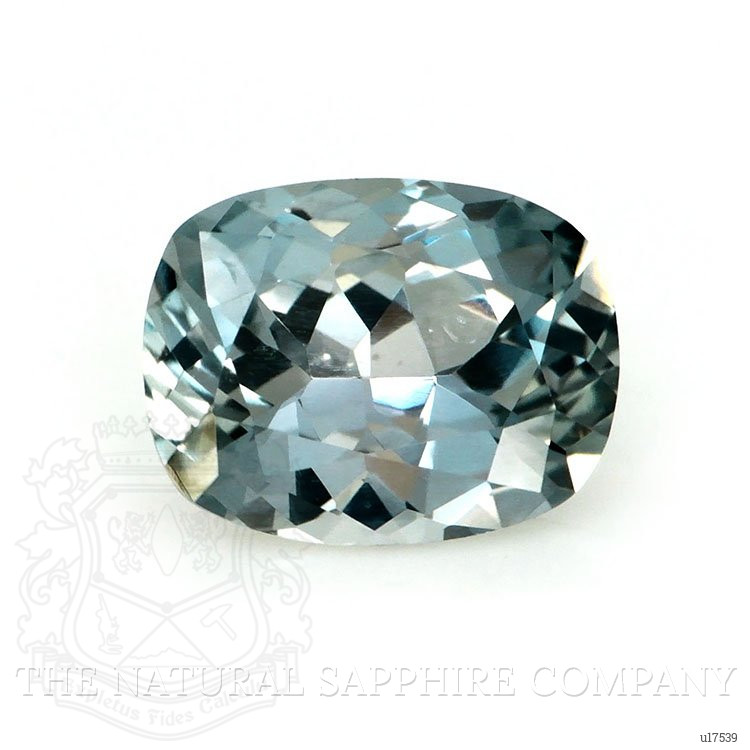 The ring features a beautiful, transparent 1.43 carat cushion shape greenish blue sapphire with the dimensions of 7.80 x 6.03 x 3.72 mm and a mixed brilliant cut. It has a clarity grade of very slightly included (evaluated at eye level), medium color saturation, and an excellent polish. The origin of this sapphire is Montana.