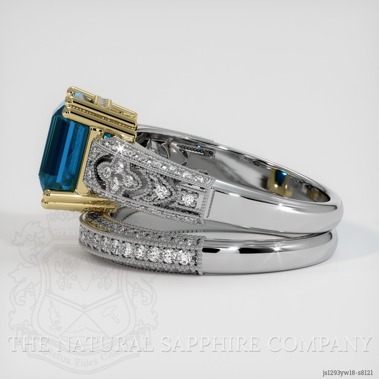 The ring features a beautiful, transparent 2.93 carat emerald cut shape greenish blue sapphire with the dimensions of 8.65 x 6.43 x 5.23 mm and a emerald cut. It has a clarity grade of very slightly included (evaluated at eye level), intense color saturation, and an excellent polish. The origin of this sapphire is Montana.