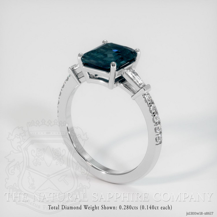 The ring features a beautiful, transparent 3.50 carat emerald cut shape greenish blue sapphire with the dimensions of 8.95 x 7.91 x 4.99 mm and a emerald cut. It has a clarity grade of eye clean (evaluated at eye level), vivid color saturation, and an excellent polish. The origin of this sapphire is Ceylon (Sri Lanka).
