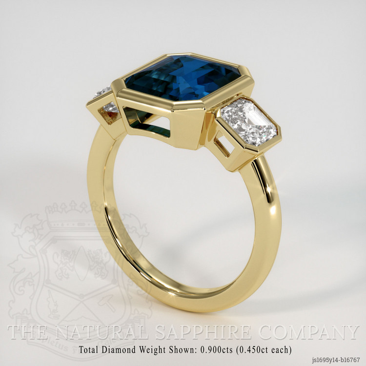 Complementing the sapphire are two white Asscher-cut, octagon-shaped diamonds, collectively weighing approximately 0.90 carats. The diamonds boast a clarity grade of VS1-VS2, ensuring minimal inclusions invisible to the naked eye. With an impressive color grade of E, these diamonds add a pure, brilliant sparkle that beautifully contrasts the deep tones of the sapphire. Together, these elements create a harmonious balance between elegance and boldness, a characteristic signature of our carefully crafted designs.
