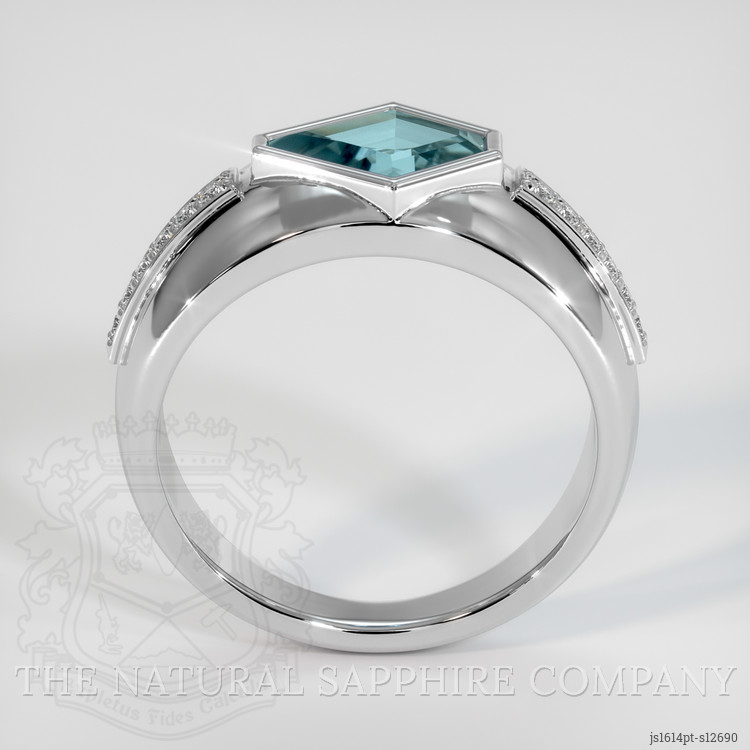 The men's ring features a beautiful, transparent 1.18 carat fancy shape greenish blue sapphire with the dimensions of 8.30 x 7.21 x 3.42 mm and a step cut. It has a clarity grade of very slightly included (evaluated at eye level), medium intense color saturation, and an excellent polish. The origin of this sapphire is Montana.