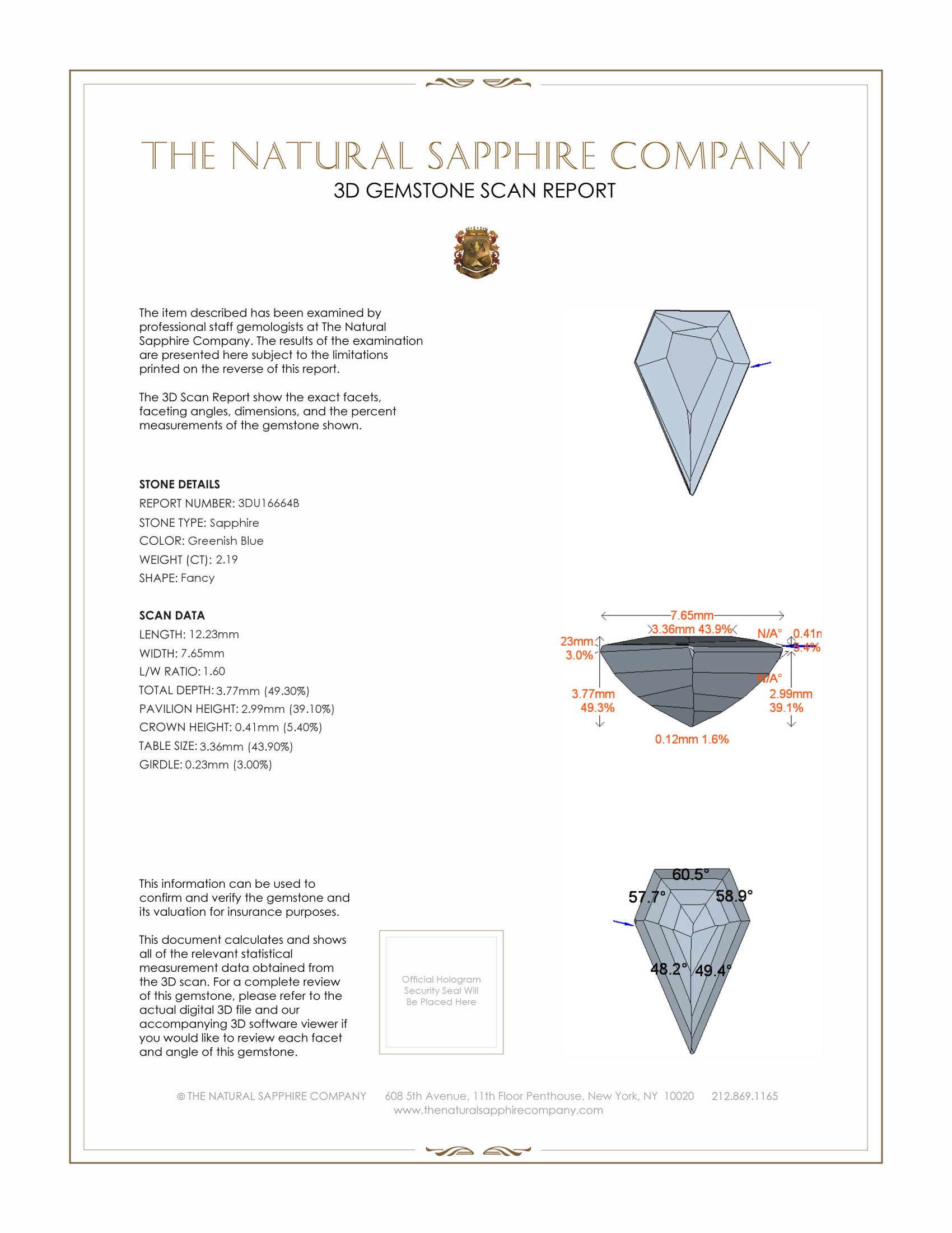The ring features a beautiful, transparent 2.19 carat fancy shape greenish blue sapphire with the dimensions of 12.23 x 7.65 x 3.77 mm and a fancy brilliant cut. It has a clarity grade of very slightly included (evaluated at eye level), medium light color saturation, and an excellent polish. The origin of this sapphire is Ceylon (Sri Lanka).