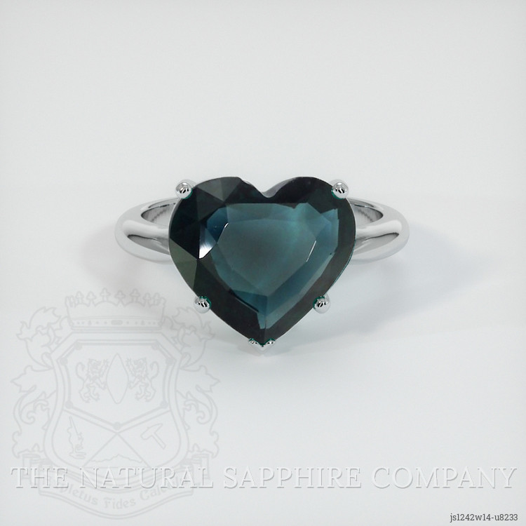 The ring features a beautiful, transparent GIA certified Dark Blue 4.54 carat heart shape greenish blue sapphire with the dimensions of 11.06 x 12.35 x 3.94 mm and a modified brilliant cut. It has a clarity grade of eye clean (evaluated at eye level), dark color saturation, and an excellent polish. The origin of this sapphire is Ceylon (Sri Lanka).