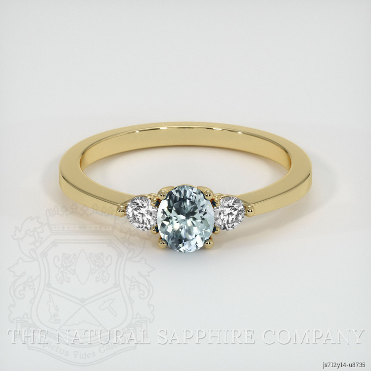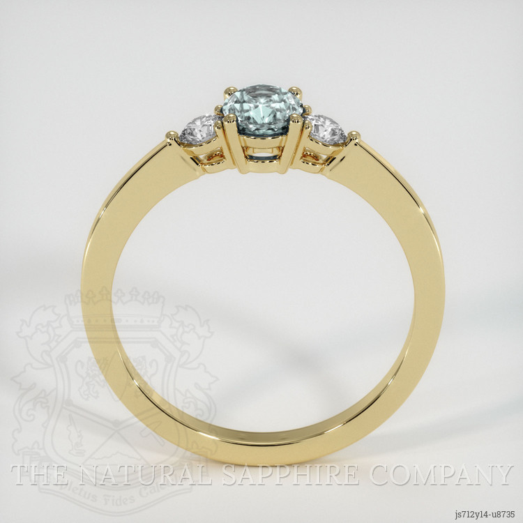 The ring features a beautiful, transparent 0.72 carat oval shape greenish blue sapphire with the dimensions of 5.79 x 4.90 x 3.46 mm and a mixed brilliant cut. It has a clarity grade of very slightly included (evaluated at eye level), light color saturation, and an excellent polish. The origin of this sapphire is Montana.