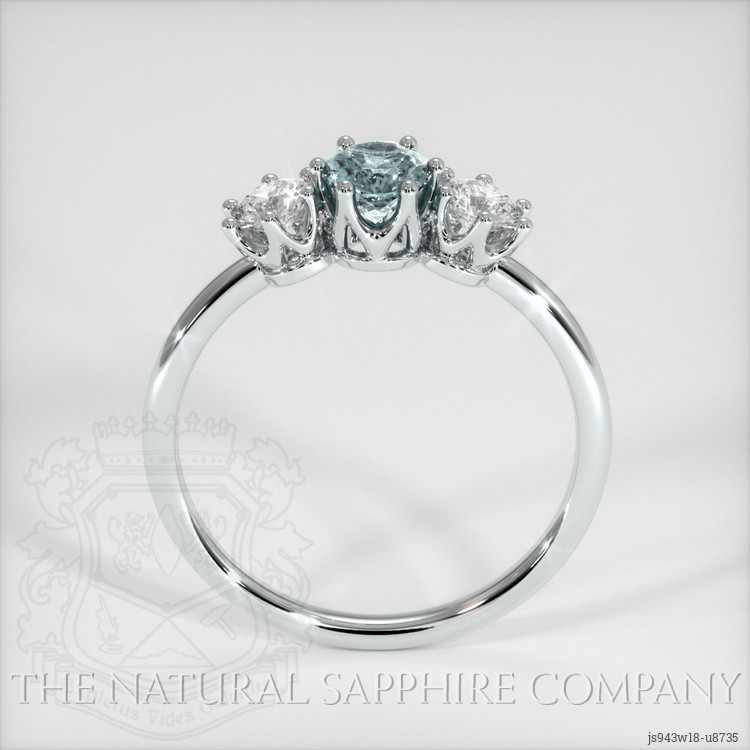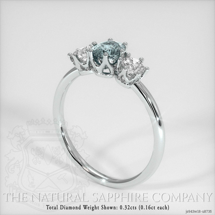 The ring features a beautiful, transparent 0.72 carat oval shape greenish blue sapphire with the dimensions of 5.79 x 4.90 x 3.46 mm and a mixed brilliant cut. It has a clarity grade of very slightly included (evaluated at eye level), light color saturation, and an excellent polish. The origin of this sapphire is Montana.