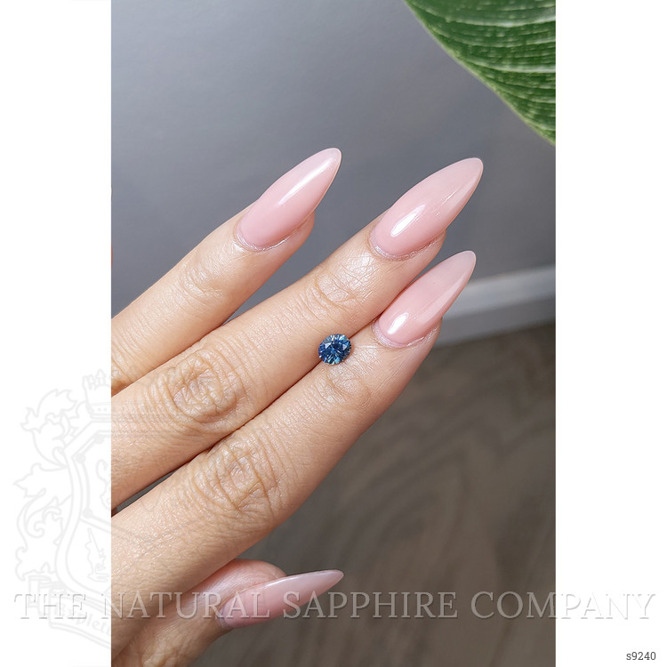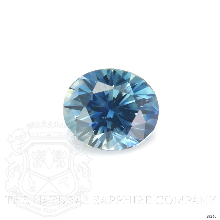 The ring features a beautiful, transparent 0.78 carat oval shape greenish blue sapphire with the dimensions of 5.80 x 4.97 x 3.64 mm and a mixed brilliant cut. It has a clarity grade of very slightly included (evaluated at eye level), medium light color saturation, and an excellent polish. The origin of this sapphire is Montana.