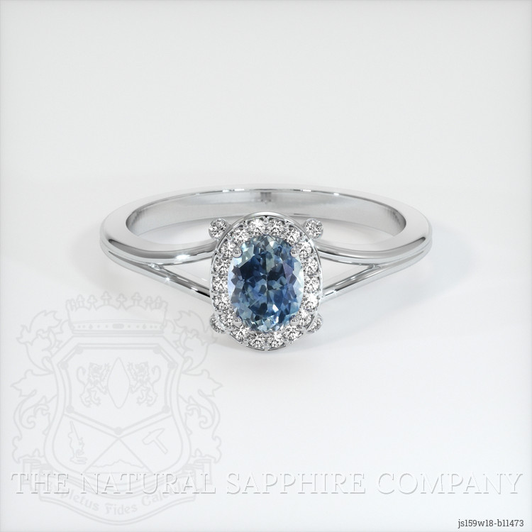 The ring features a beautiful, transparent 0.79 carat oval shape greenish blue sapphire with the dimensions of 6.30 x 4.95 x 3.43 mm and a mixed brilliant cut. It has a clarity grade of very slightly included (evaluated at eye level), intense color saturation, and an excellent polish. The origin of this sapphire is Montana.