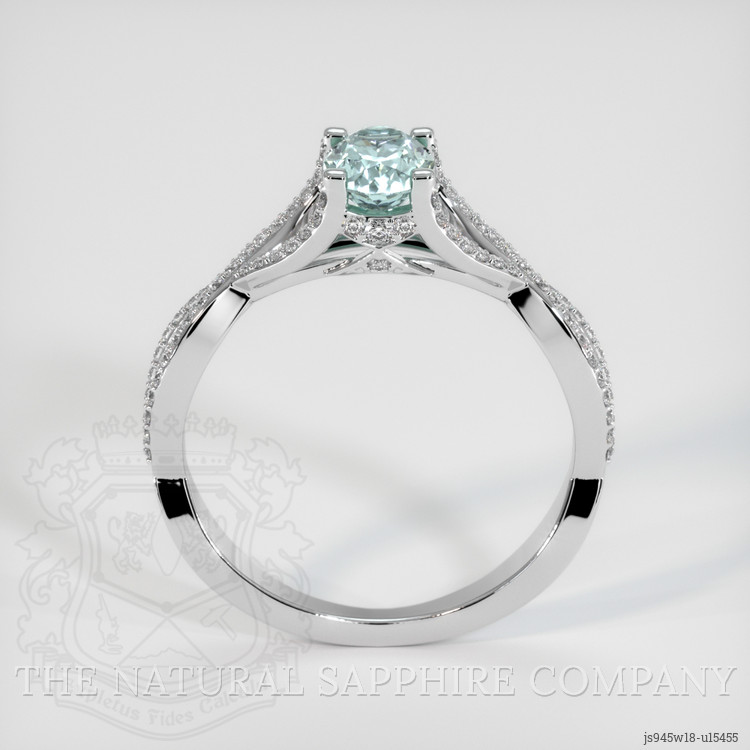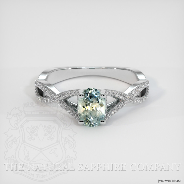 The ring features a beautiful, transparent 0.79 carat oval shape greenish blue sapphire with the dimensions of 6.52 x 4.65 x 3.44 mm and a mixed brilliant cut. It has a clarity grade of very slightly included (evaluated at eye level), medium color saturation, and an excellent polish. The origin of this sapphire is Montana.