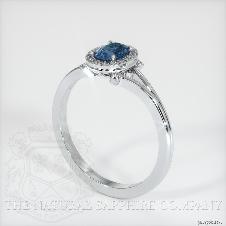 The ring features a beautiful, transparent 0.79 carat oval shape greenish blue sapphire with the dimensions of 6.30 x 4.95 x 3.43 mm and a mixed brilliant cut. It has a clarity grade of very slightly included (evaluated at eye level), intense color saturation, and an excellent polish. The origin of this sapphire is Montana.