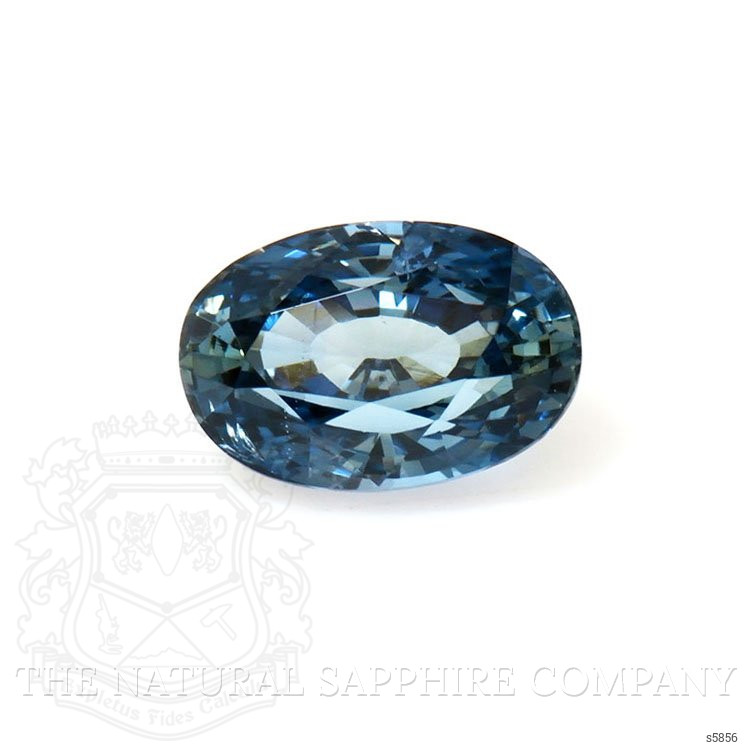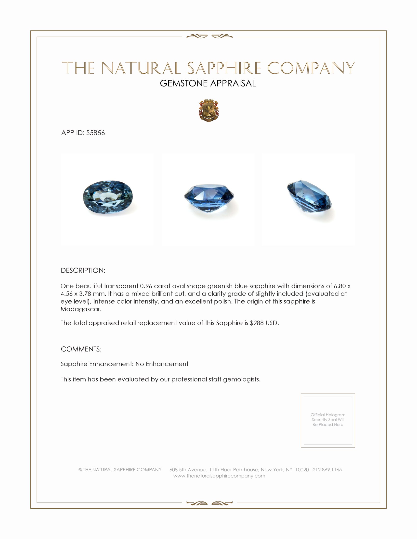 The ring features a beautiful, transparent 0.96 carat oval shape greenish blue sapphire with the dimensions of 6.80 x 4.56 x 3.78 mm and a mixed brilliant cut. It has a clarity grade of slightly included (evaluated at eye level), intense color saturation, and an excellent polish. The origin of this sapphire is Madagascar.