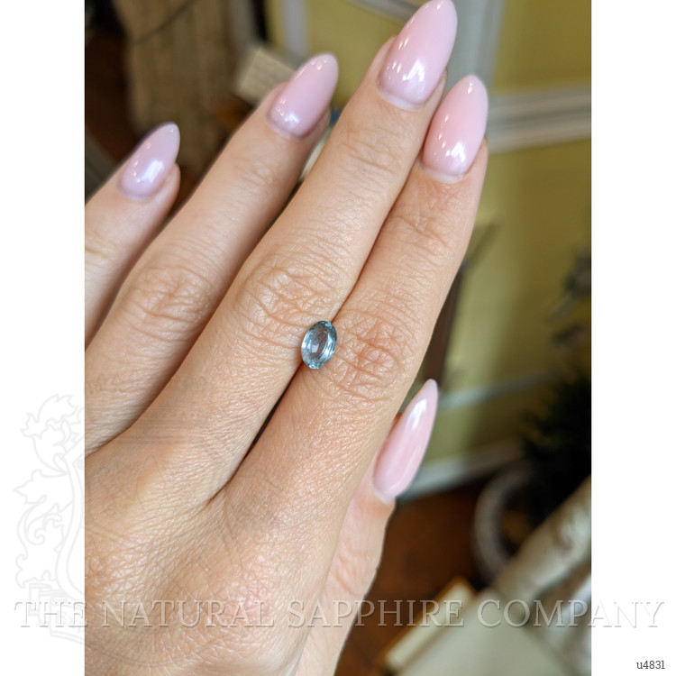 The ring features a beautiful, transparent 1.13 carat oval shape greyish blue sapphire with the dimensions of 7.22 x 4.86 x 3.43 mm and a mixed brilliant cut. It has a clarity grade of very slightly included (evaluated at eye level), medium intense color saturation, and an excellent polish. The origin of this sapphire is Montana.