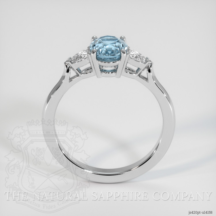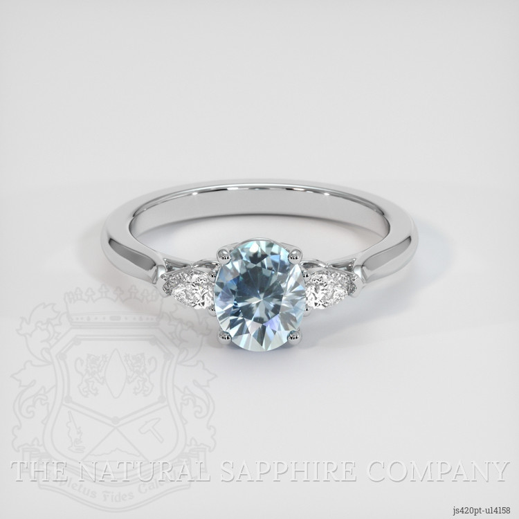 The ring features a beautiful, transparent 1.32 carat oval shape greenish blue sapphire with the dimensions of 6.93 x 5.73 x 4.41 mm and a mixed brilliant cut. It has a clarity grade of eye clean (evaluated at eye level), medium color saturation, and an excellent polish. The origin of this sapphire is Montana.