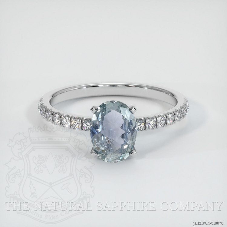The ring features a beautiful, transparent 1.52 carat oval shape greenish blue sapphire with the dimensions of 8.66 x 6.45 x 3.32 mm and a mixed brilliant cut. It has a clarity grade of slightly included (evaluated at eye level), medium light color saturation, and an excellent polish. The origin of this sapphire is Montana.